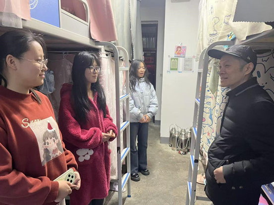 同时,学院积极组织开展新学期学生宿舍走访活动。学院领导、研究生导师、班主任和辅导员们先后深入兰天公寓、未来书院和知行校区学生宿舍,为同学们送上新学期的深切关怀。在走访过程中,老师们详细了解同学们的寒假生活和返校情况,叮嘱同学们保持宿舍干净整洁,注意消防安全和财产安全,谨防电信诈骗,按时上课、认真学习,以良好的状态迎接新的学期。同时,老师们还了解了本学期实习同学的实习单位、工作情况,毕业班同学们的就业意向和签约情况。针对同学们反映的学习压力问题,从时间管理、学习方法、心理调适等多个角度给出建议,还在饮食健康、作息规律、人际交往等校园生活方面给予了全面细致的指导。