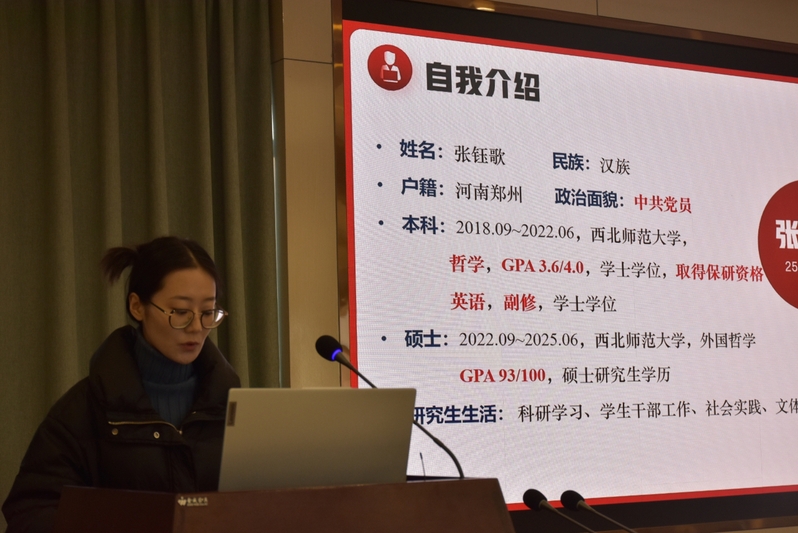 评审会现场气氛热烈,座无虚席。经过前期严格筛选,共有3位品学兼优的同学脱颖而出,进入最终答辩环节,他们分别是来自2023级社会工作硕士班的马天瑀同学、2022级哲学硕士班的冯雅丽和张钰歌同学。